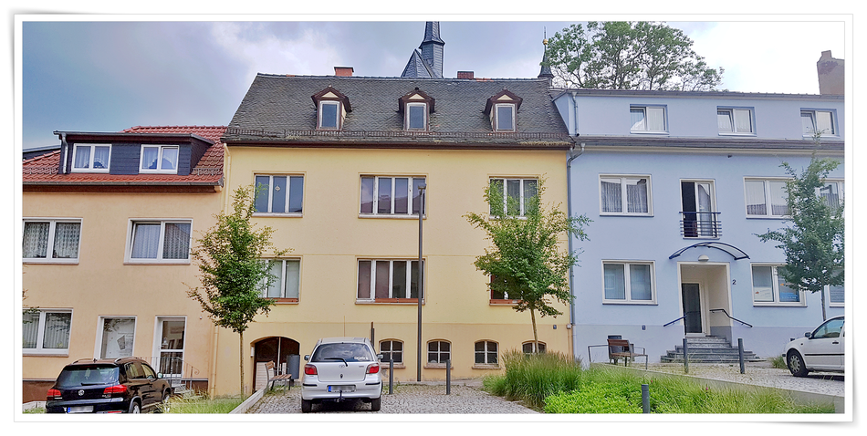 DIE 1895 GESTALTETE 7 FENSTER FRONT GING BEI EINER DDR SANIERUNG IM JAHRE 1963 VERLOREN. SEITDEM LEIDET DIE HAUSFRONT UNTER EINEM UNSYMMETRISCHEN ERSCHEINUNGSBILD.